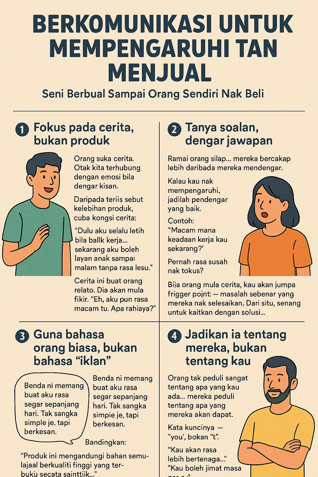 Bila orang mula cerita, kau akan jumpa trigger point — masalah sebenar yang mereka nak selesaikan. Dari situ, senang untuk kaitkan dengan solusi… tanpa terasa macam jual.