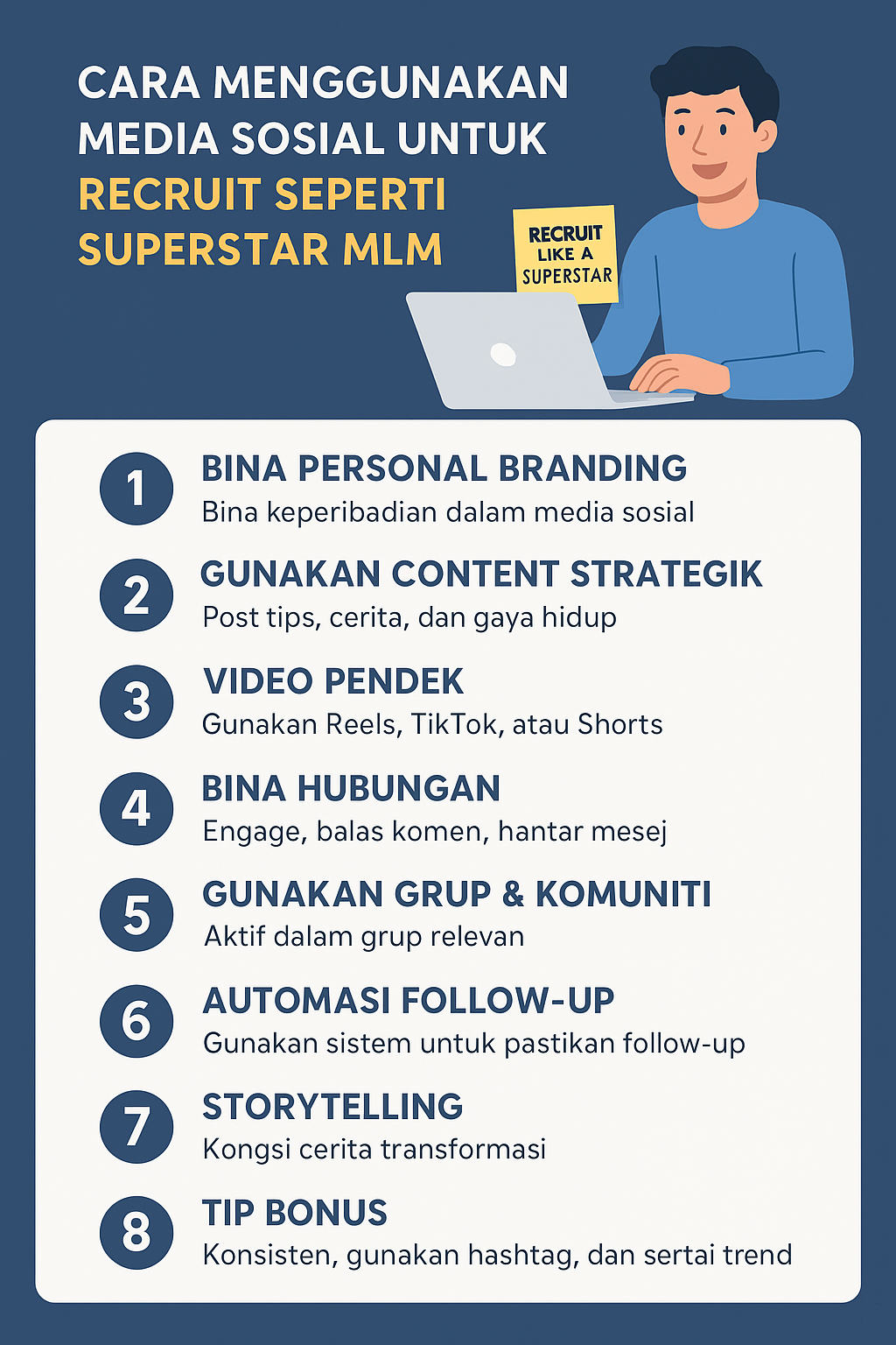 Media sosial adalah platform paling berkuasa untuk recruit prospek dalam MLM, jika digunakan dengan strategi superstar. Ingat, kejayaan bukan datang dari post produk semata-mata, tapi dari: